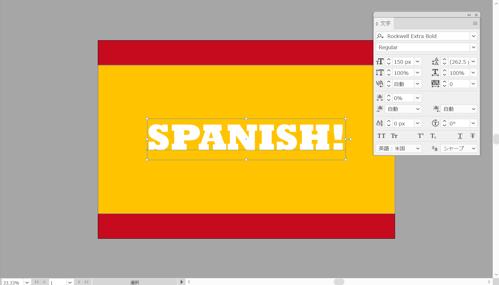文字ツール(T)をピックして文字パネルウィンドウ>文字>文字を開きます。「RockwellExtraBold」フォントを選択し、サイズを150ピクセルに設定します。アートボードをクリックして、白い「SPANISH!」というテキストを追加します。