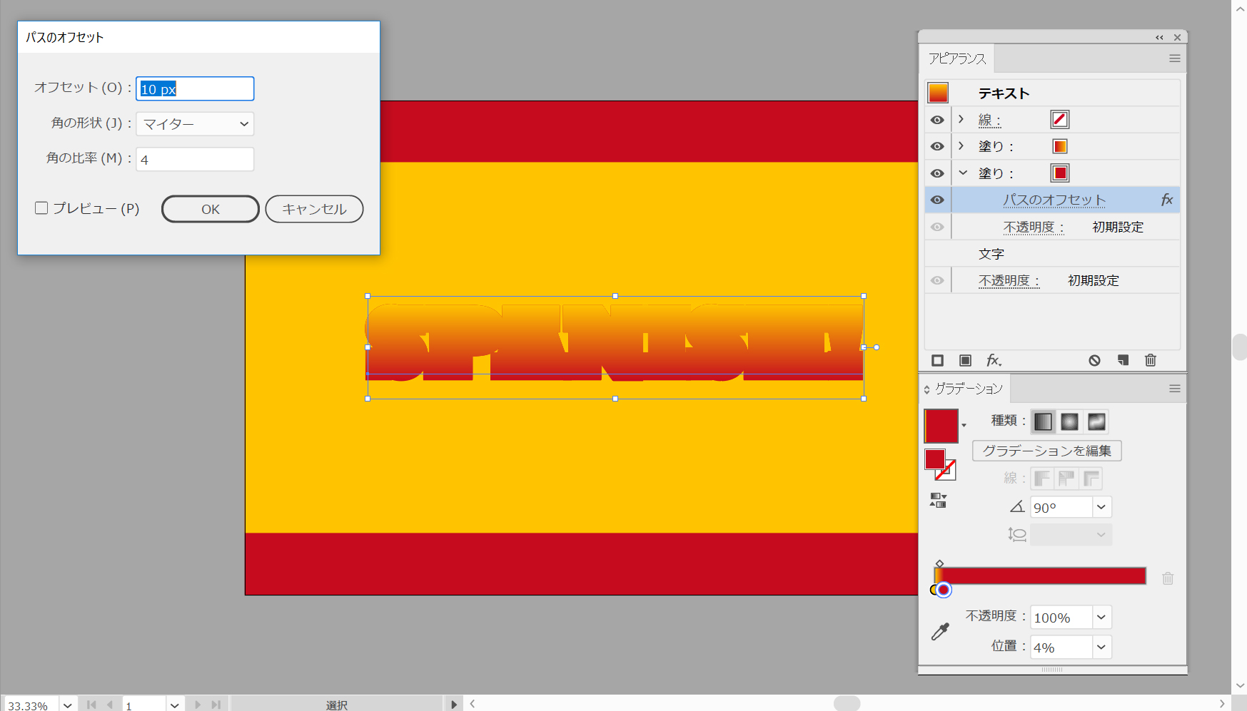 この新しい塗りつぶしを選択したまま、効果>パス>オフセットパスを選択します。10ピクセルのオフセットを入力し、そのOKボタンをクリックします。