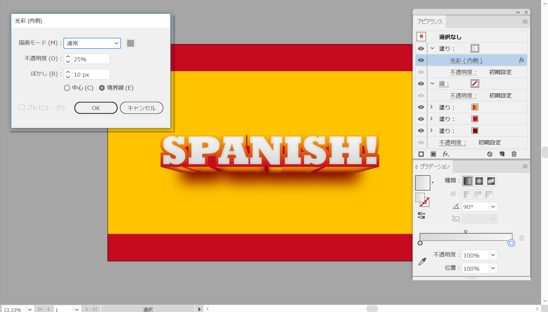 テキストがまだ選択されていることを確認して、アピアランスパネルに注目します。4番目の塗りを追加して、他の塗りの上にドラッグします。以下に示す線形グラデーションを適用してから、効果>スタイル>内部グローの順に選択します。次の図に示す属性を入力して、[OK]をクリックします。