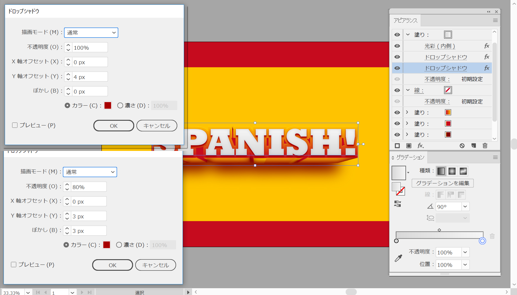 テキストがまだ選択されていることを確認して、アピアランスパネルを開きます。一番上の塗りつぶしを選択して、効果>スタイル>ドロップシャドウを選択します。次の図の左側のウィンドウに表示されている属性を入力し、[OK]ボタンをクリックしてから、効果>スタイル>ドロップシャドウの順に選択します。その2番目のウィンドウから属性を入力して、[OK]をクリックします。