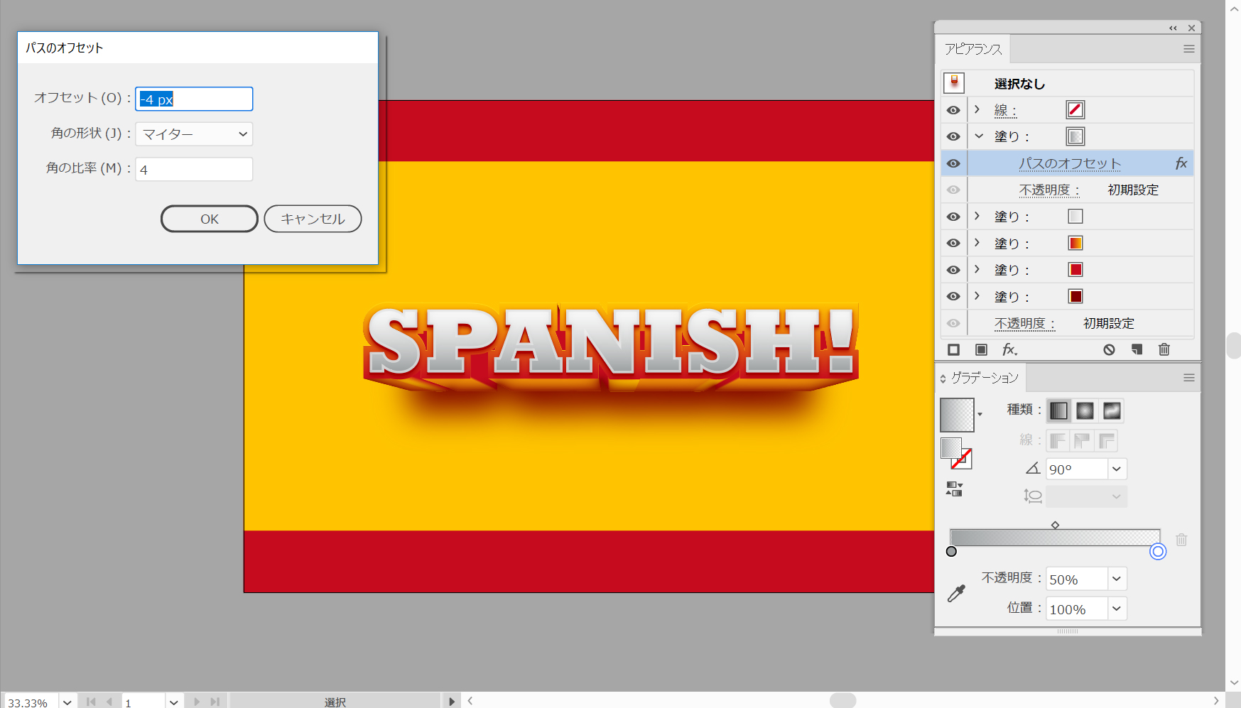 以下に示す線形グラデーションを適用し、不透明度を70%に下げてから、効果>パス>パスのオフセットに進みます。オフセット値を「-4px」と入力し、[OK]をクリックします。グラデーション画像の黄色の数字は不透明度の割合を表しています。