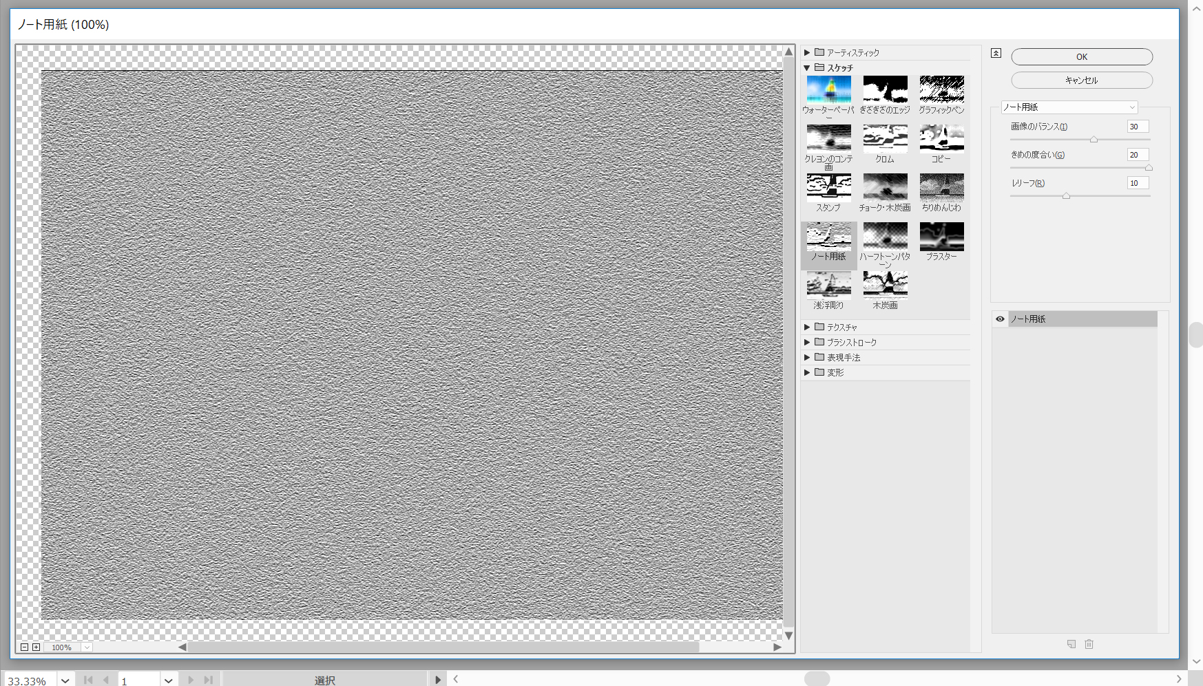 前の手順で追加した四角形がまだ選択されていることを確認し、[アピアランス]パネルに焦点を合わせて2番目の塗りつぶしを追加します。黒にし(R=0G=0B=0)、不透明度を20%に下げ、ブレンドモードをソフトライトに変更します。次に、効果/スケッチ/ノート用紙に移動します。次の図に示す属性を入力してから、[OK]ボタンをクリックします。