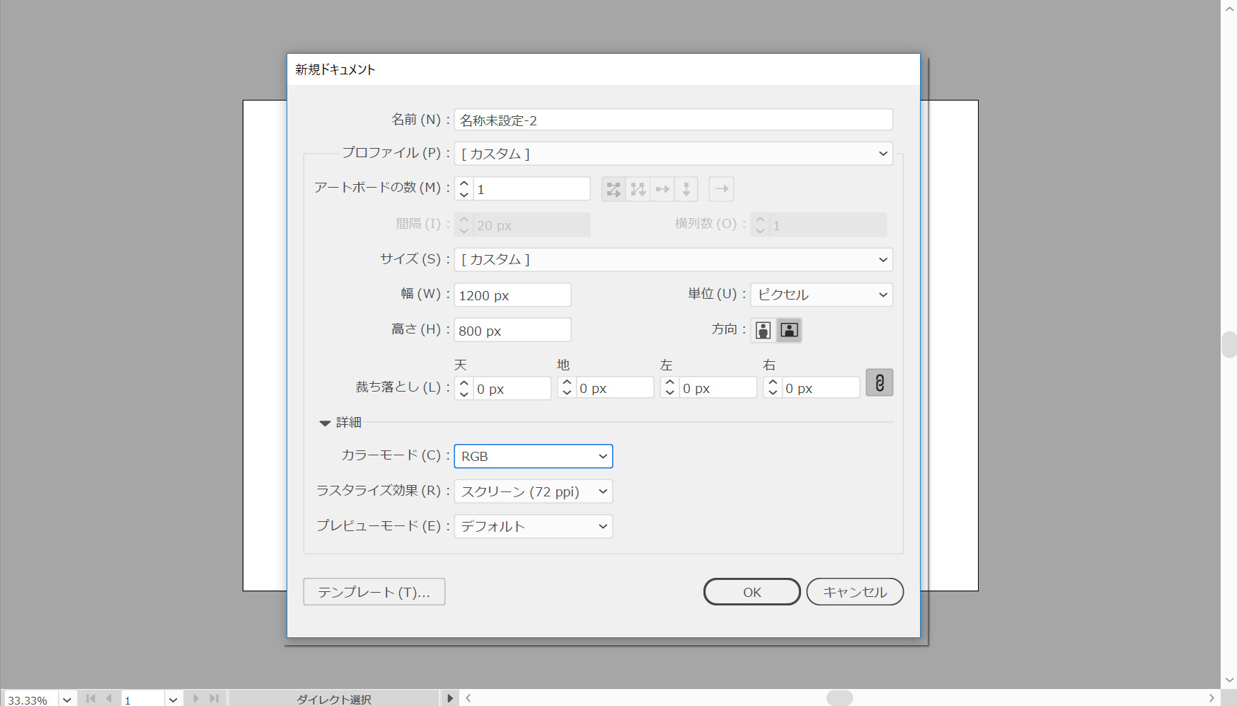 新規作成します(Ctrl+N)。[プロファイル]ドロップダウンメニューから[Web]を選択し、幅ボックスに850、高さボックスに450と入力し、[詳細設定]ボタンをクリックします。[カラーモード(C)]から[RGB]を選択し、[ラスタライズ効果]から[スクリーン(72ppi)]に設定してから、ドキュメントの作成をクリックします。
