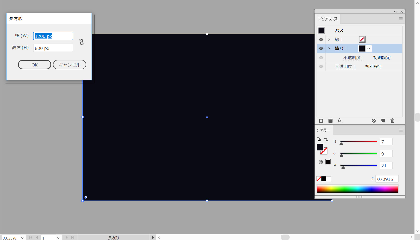 長方形ツール(M)を選択します。ツールバーから境界線の色を削除し、塗りを「#070915」に設定します。アートボードに移動して、1200×800ピクセルの長方形を作成します。グリッドとグリッドに合わせる機能によって、これを簡単に進めることができます。