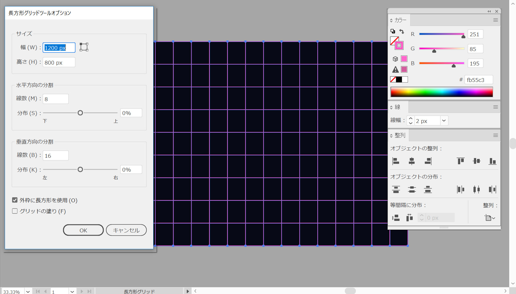 長方形グリッドツール(直線ツールの中)を選択して、アートボードをクリックしてください。次の図に示すすべての属性を入力してから、「OK」をクリックします。