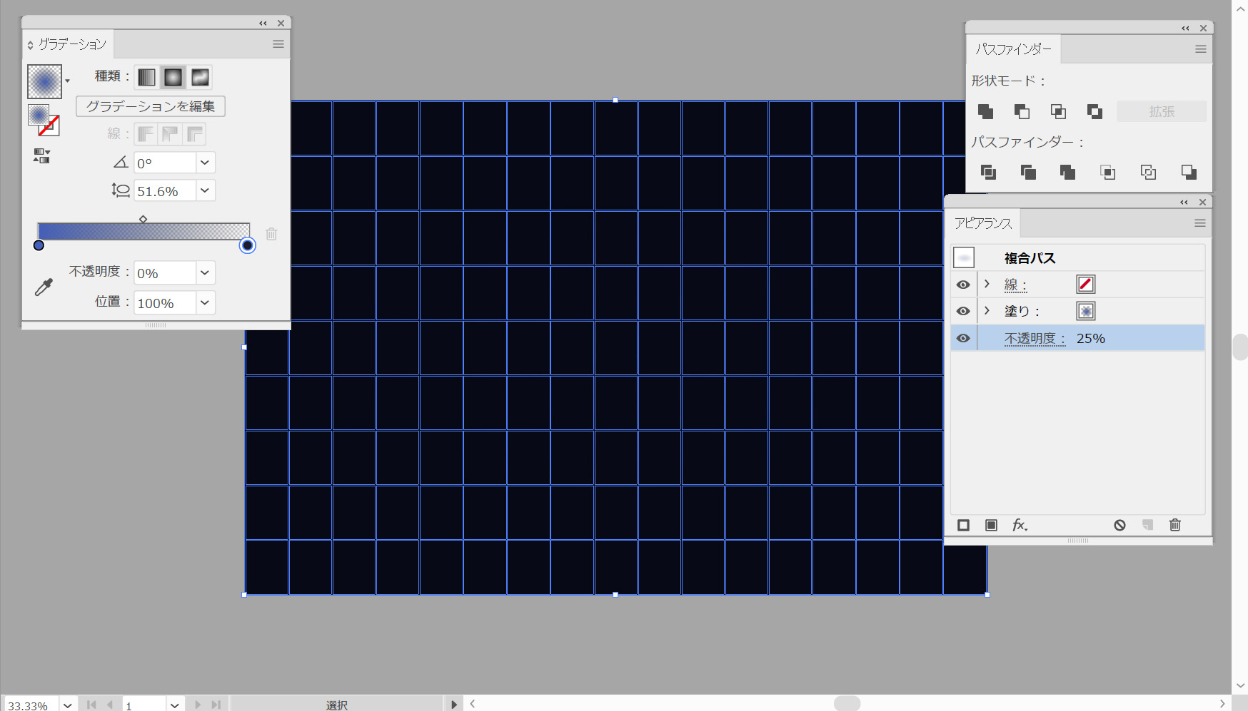ピンク色のパスのグループが選択されたままになっていることを確認して、オブジェクト>パス>パスのアウトラインに移動します。パスファインダパネル(ウィンドウ>パスファインダ)に移動して、[結合]ボタンをクリックします。結果の形状を下に示す放射状グラデーションで塗りつぶし、その不透明度を25%に下げます。