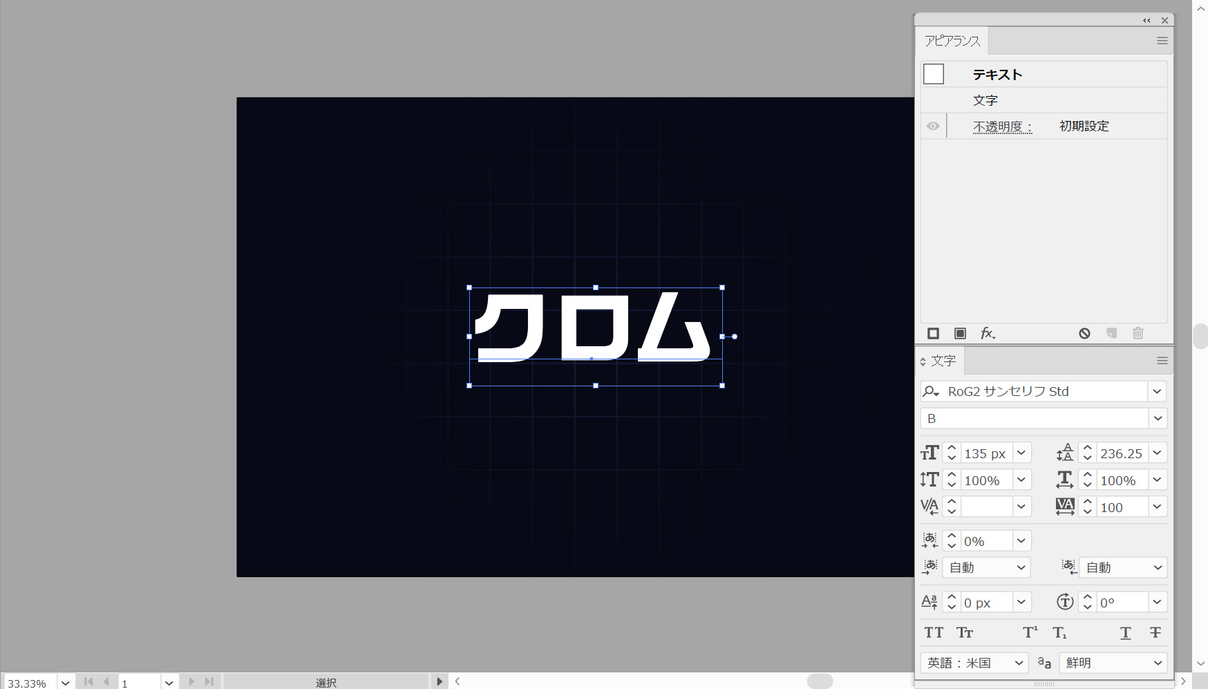文字ツール(T)をピックして文字パネル(ウィンドウ>文字>文字)を開きます。「Bauhaus93」フォント(または好みの太字フォント)を選択し、サイズを135pxに、トラッキングを100に設定します。アートボードをクリックし、「CHROME」とテキストを追加して白(#ffffff)にします。