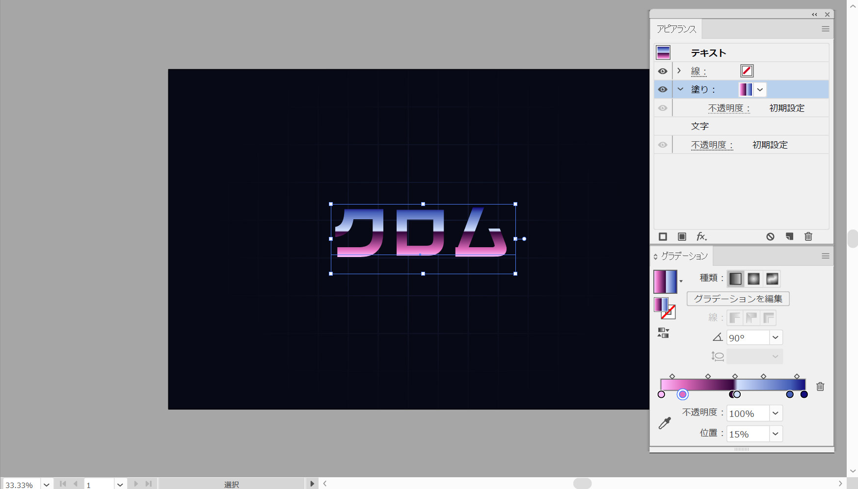 追加したテキストが選択されたままであることを確認し、白い塗りつぶしの色を削除します。アピアランスパネルに移動して、[新しい塗りつぶしを追加]ボタンを使用してテキストに新しい塗りを追加します。新しい塗りを選択して、下に示す線形グラデーションを適用します。完了したら、このグラデーションをスウォッチパネル内に保存します(ウィンドウ>スウォッチ)。
