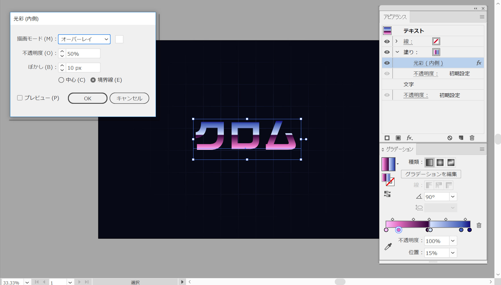 テキストがまだ選択されていることを確認し、アピアランスパネルを開きます。既存の塗りつぶしを選択して、効果>スタイライズ>光彩(内側)に移動します。次の図に示す属性を入力してから、[OK]ボタンをクリックします。