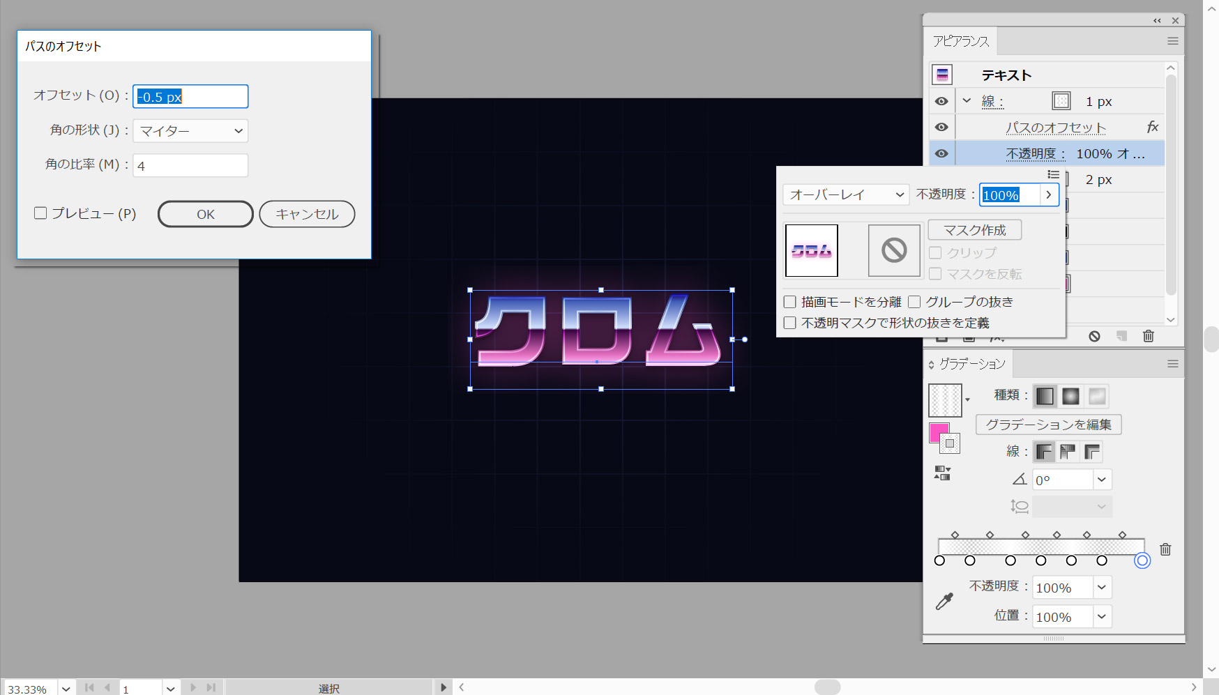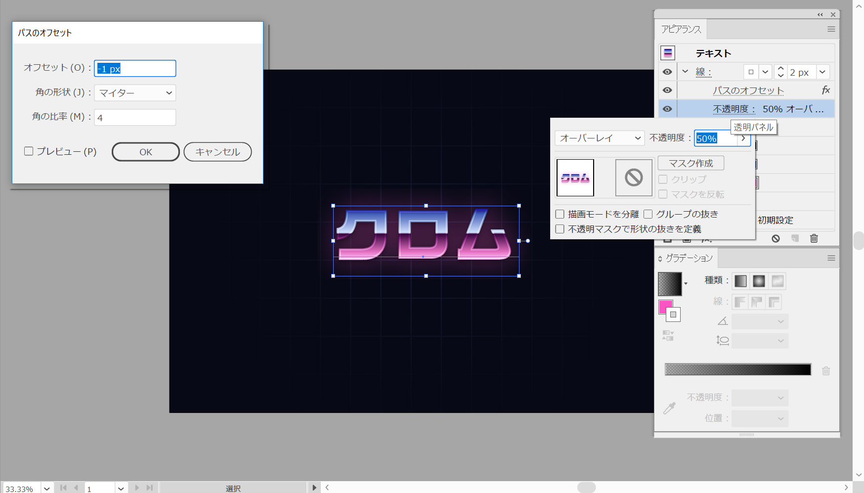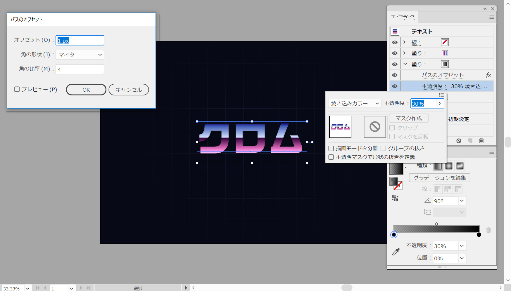 テキストがまだ選択されていることを確認し、アピアランスパネルを開きます。3番目の塗りつぶしを追加し、既存の2つの塗りつぶしの間にドラッグします。不透明度を30%に下げ、[ブレンドモード:焼きこみカラー]に変更し、以下に示す線形グラデーションを適用してから、効果>パス>オフセットパスに移動します。1ピクセルのオフセットパスを入力し、[OK]をクリックします。
