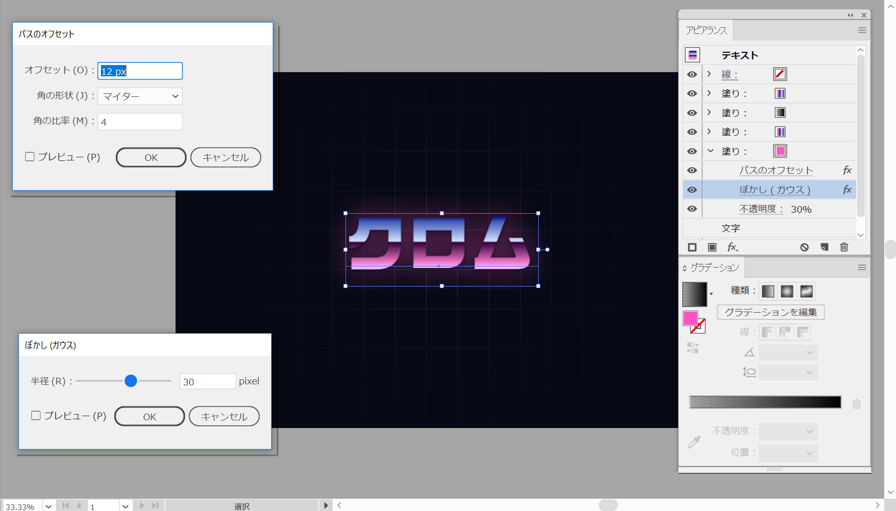 テキストがまだ選択されていることを確認し、アピアランスパネルを開きます。4番目の塗りを追加してステップ5までに作成してきた塗りの一番下にドラッグします。不透明度を30%に下げ、色をR=251G=85B=195に設定してから、効果>パス>オフセットパスに移動します。12ピクセルのオフセットを入力し、そのOKボタンをクリックしてから、効果>ぼかし>ガウスぼかしを選択します。30ピクセルの半径を入力し、[OK]をクリックします。