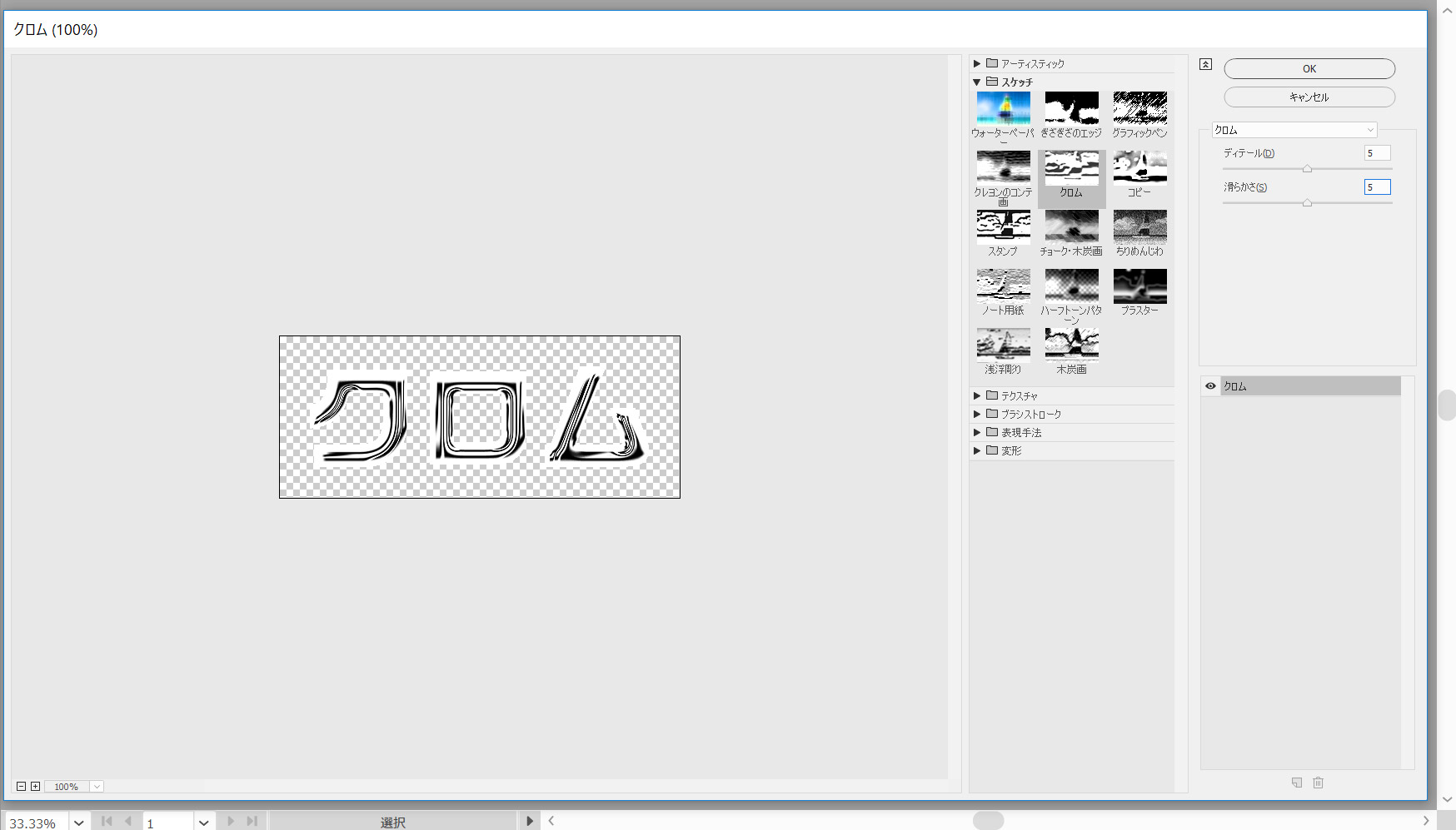 新しい塗りを選択し、色を黒に設定します(R=0G=0B=0)。不透明度を5%に下げ、ブレンドモードをオーバーレイに変更してから、効果>パス>オフセットパスを選択します。2ピクセルのオフセットを入力し、そのOKボタンをクリックしてから、効果>スケッチ>クロムに移動します。次の図に示す属性を入力して、[OK]をクリックします。