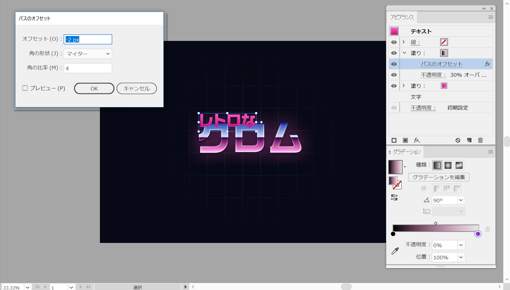 あなたの”Retro”テキストがまだ選択されていることを確認し、Appearanceパネルに焦点を合わせ続け、そして2番目の塗りつぶしを追加してください。それを選択して、以下に示す線形グラデーションを適用してください。不透明度を30%に下げ、ブレンドモードをオーバーレイに変更してから、効果>パス>オフセットパスを選択します。-2ピクセルのオフセットを入力し、[OK]をクリックします。
