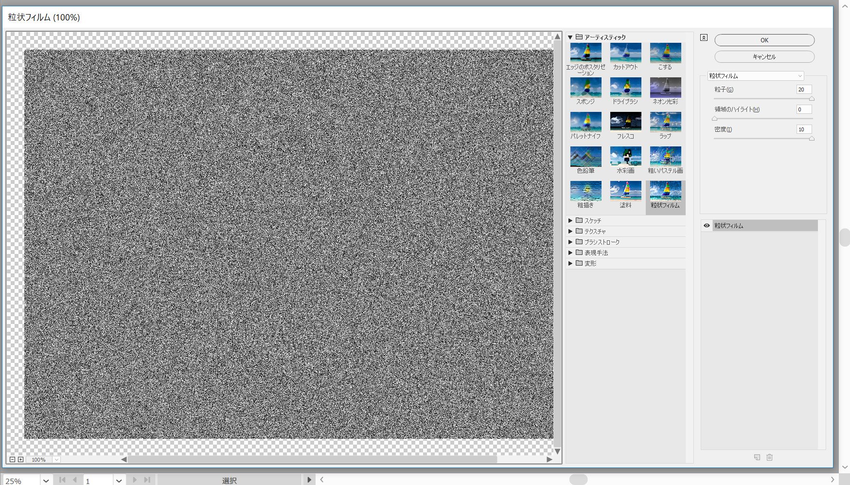 長方形ツール(M)を使用して、新しい1200x800pxの長方形を作成し、中央に配置します。塗りつぶしの色を黒(#000000)に設定し、その不透明度を5%に下げ、ブレンドモードをソフトライトに変更してから、効果>アーティスティック>粒状フィルムに移動します。次の図に示す属性を入力して、[OK]をクリックします。