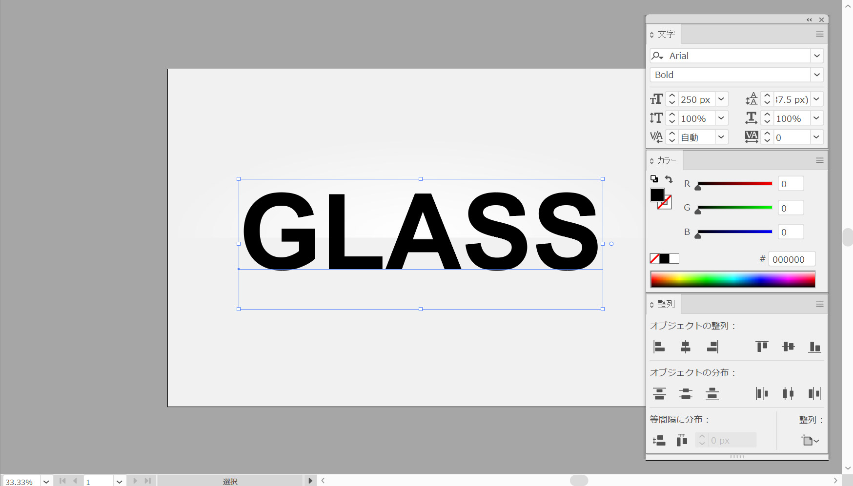 ツールバーの塗りつぶし色を黒に設定します(#000000)。文字パネル(ウィンドウ>文字>文字)を開き、「Arial」フォントを選択して、サイズを250ピクセルに設定します。文字ツール(T)を選択し、アートボードをクリックして、「GLASS」というテキストを追加します。