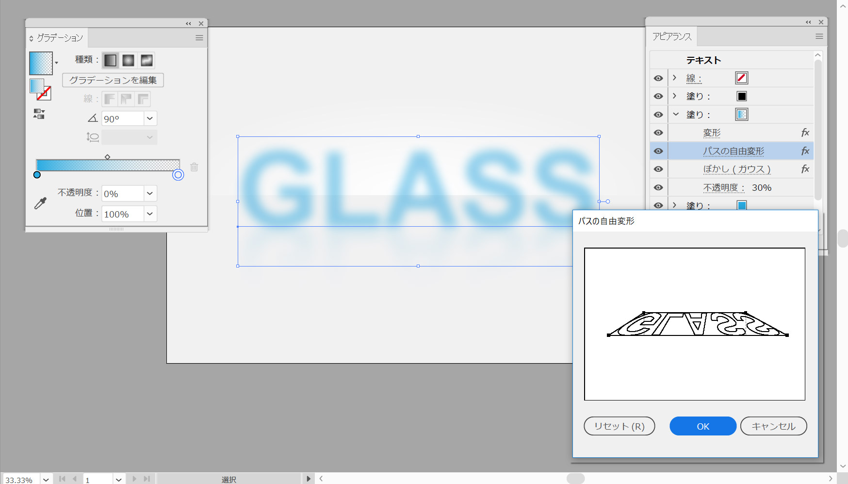 効果>変形と変形>自由変形と選択して、下の図に示すように下部の点をドラッグし、[OK]をクリックします。