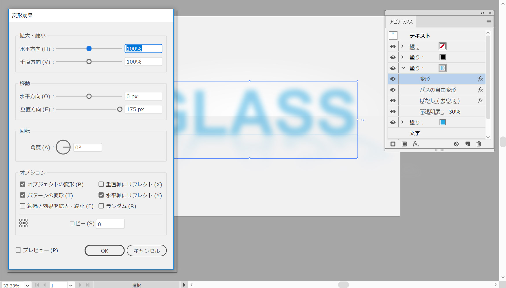 この新しい塗りつぶしを選択し、他の2つの塗りつぶしの下にドラッグして、下に示す線形グラデーションを適用します。不透明度を30%に下げて、効果>変形と変形>変形を選択します。以下に示す属性を入力し、[OK]をクリックします。