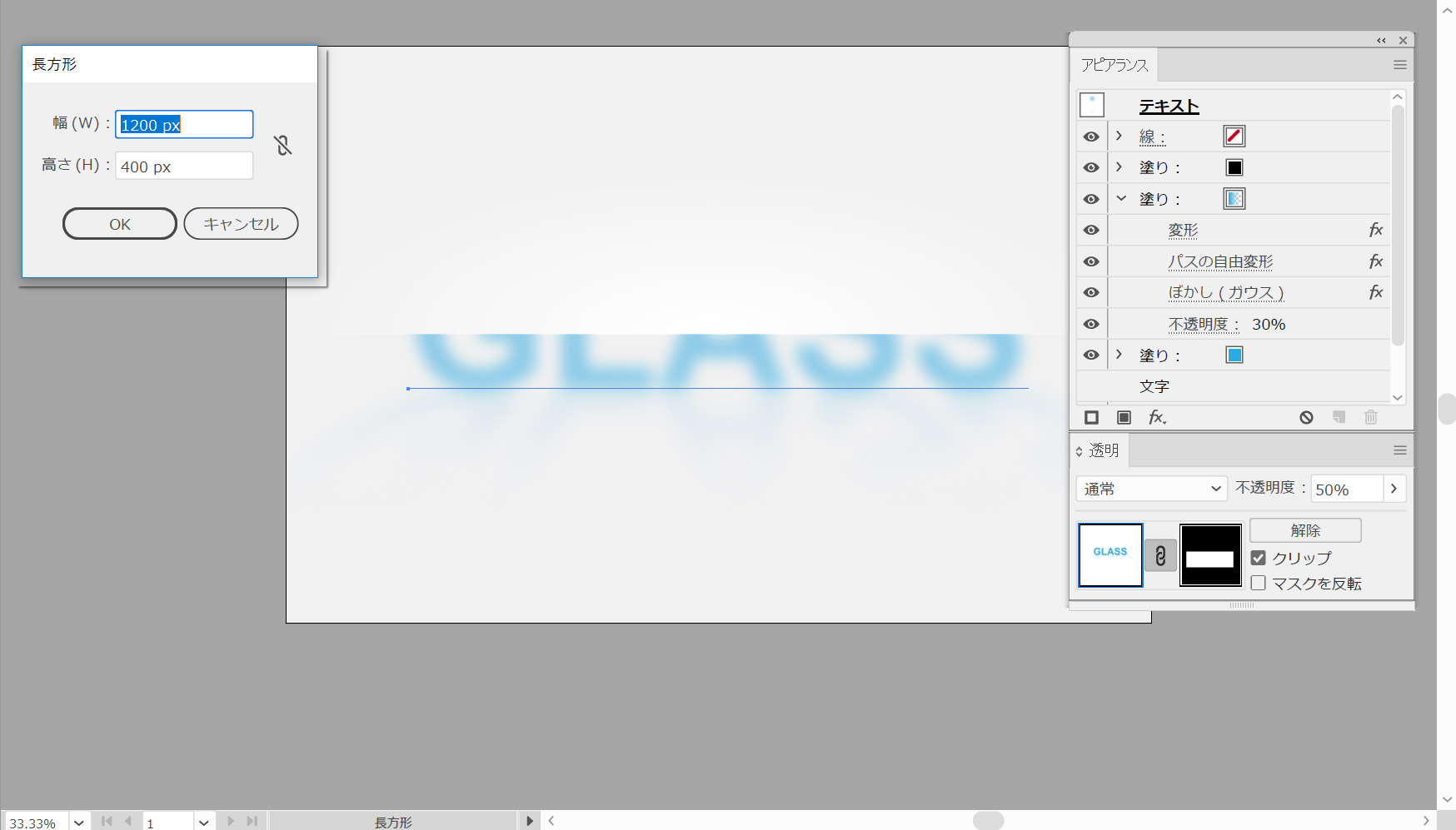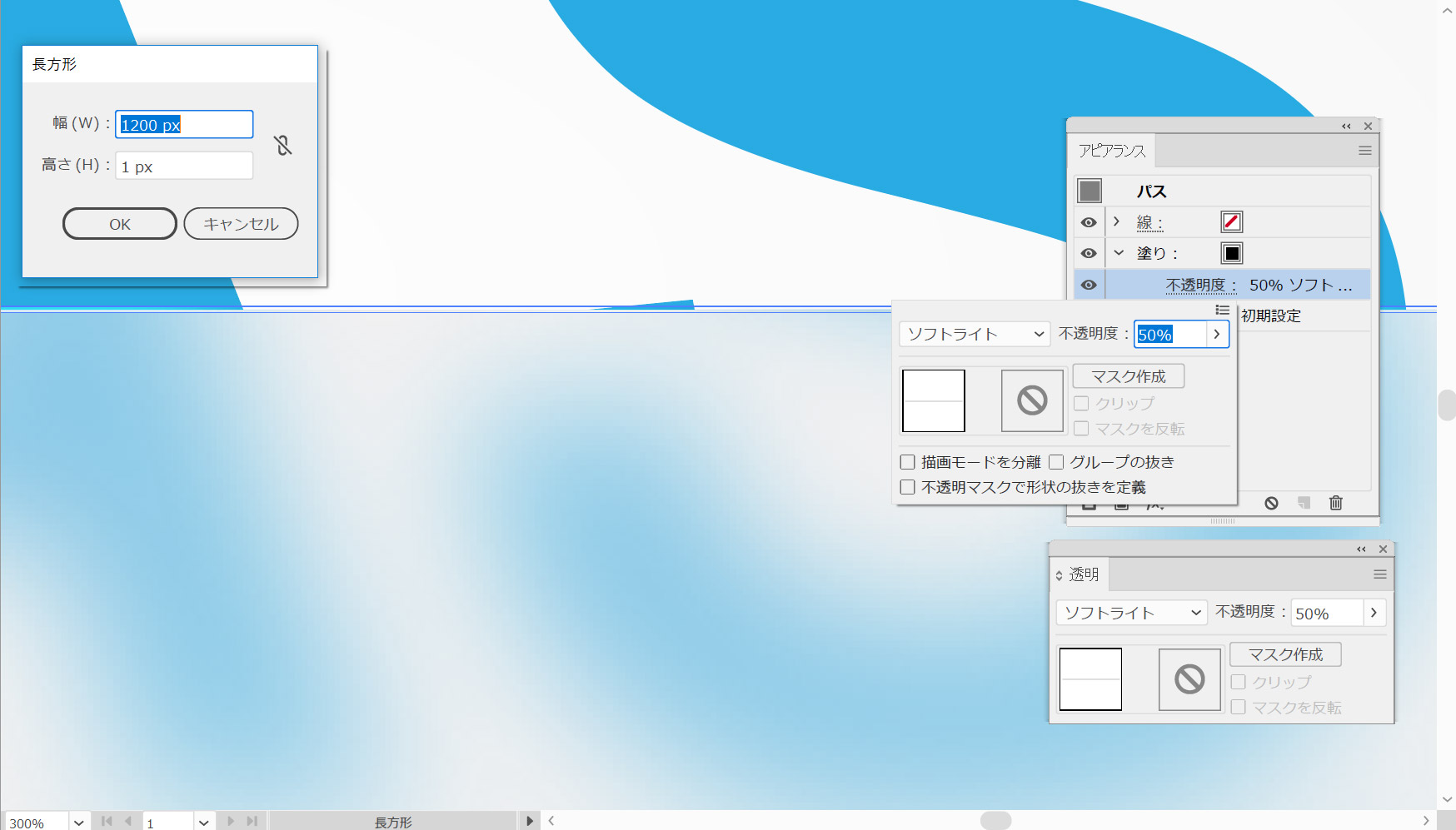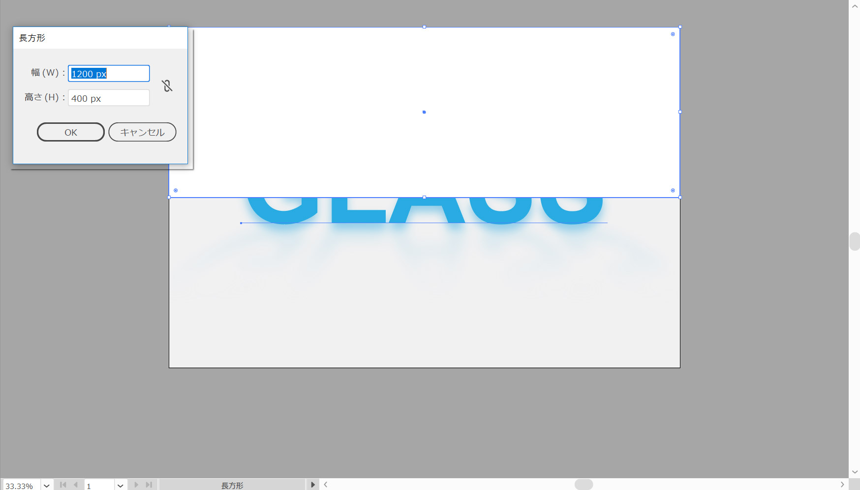 長方形ツール(M)を選択し、アートボードをクリックして長方形ウィンドウを開きます。幅を1200ピクセル、高さを1ピクセルに設定し、[OK]をクリックして細い長方形を作成します。