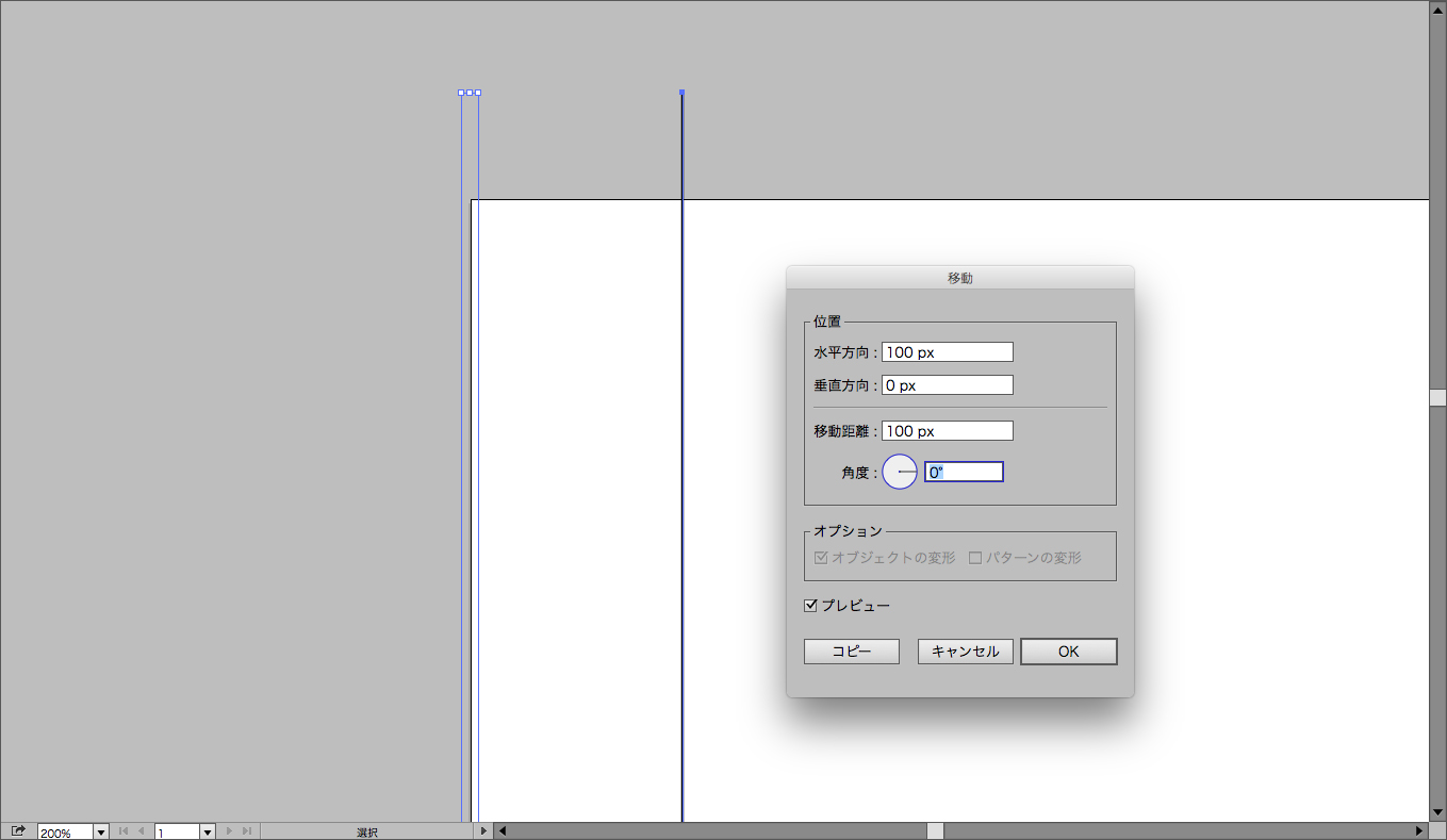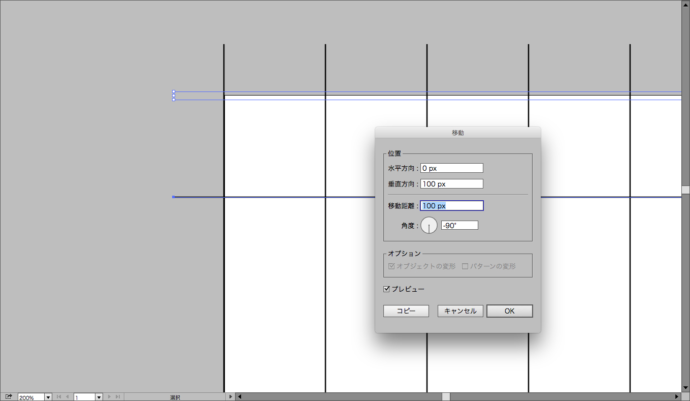 今度は水平線を使います。[移動オプション]ウィンドウで、[垂直]フィールドに100pxと入力してから、アートボードをグリッドパターンで塗りつぶすように変換を繰り返します。