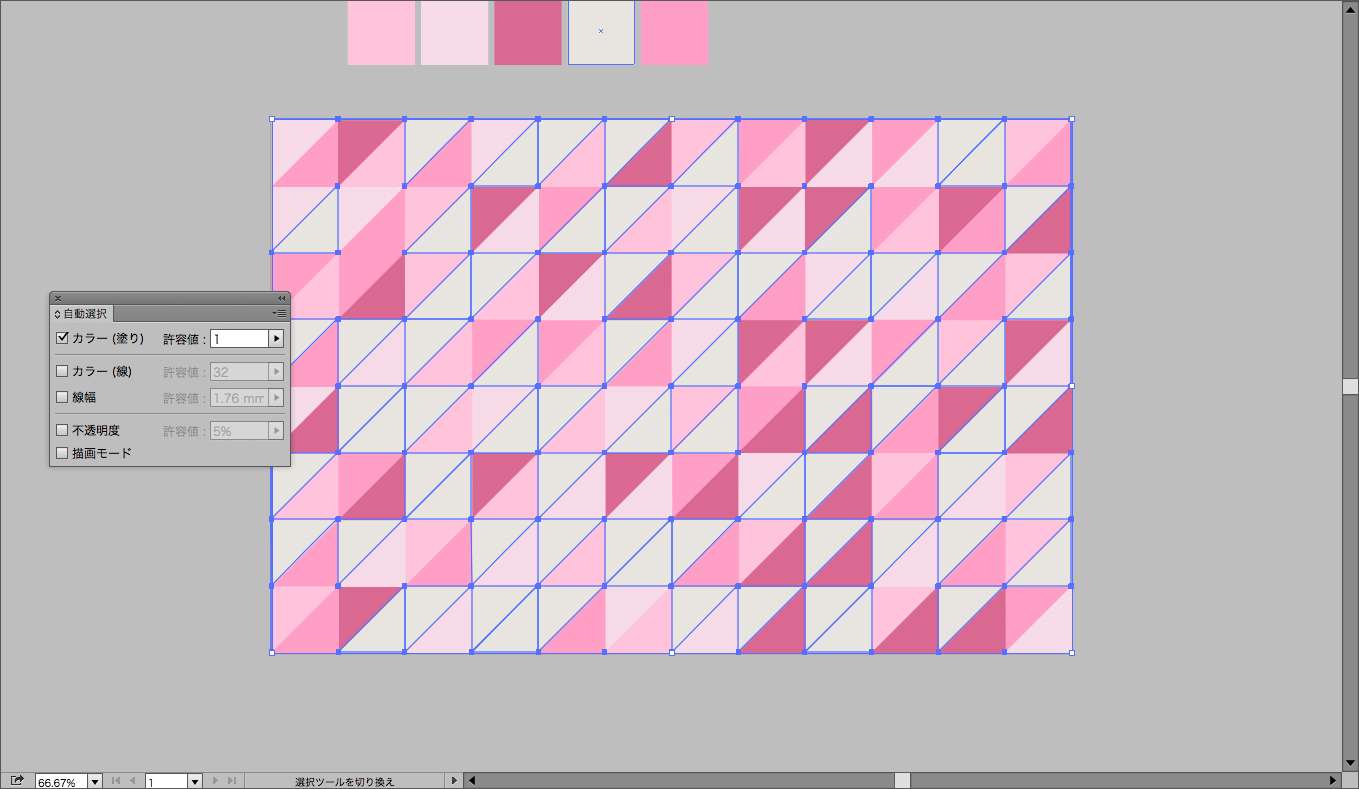 最後の色は、自動選択ツールを用いて塗り残しのないようにしましょう。自動選択ツールをダブルクリックし、許容値:1を入力し、まだ塗りのない場所を選択して最後の塗りを追加します。
