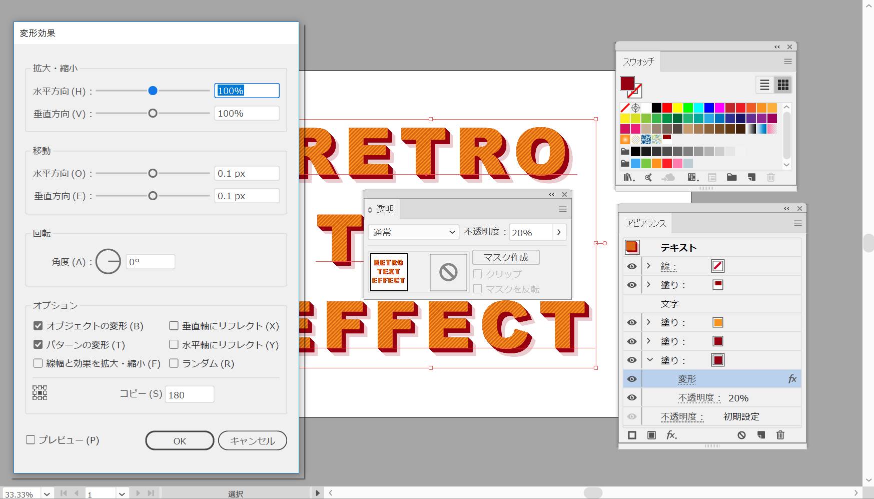それを選択し、色を「#970012」に設定し、不透明度を20%に下げてから、「効果>パス変形>変形」を選択します。 次の図に示す属性を入力して、「OK」ボタンをクリックします。