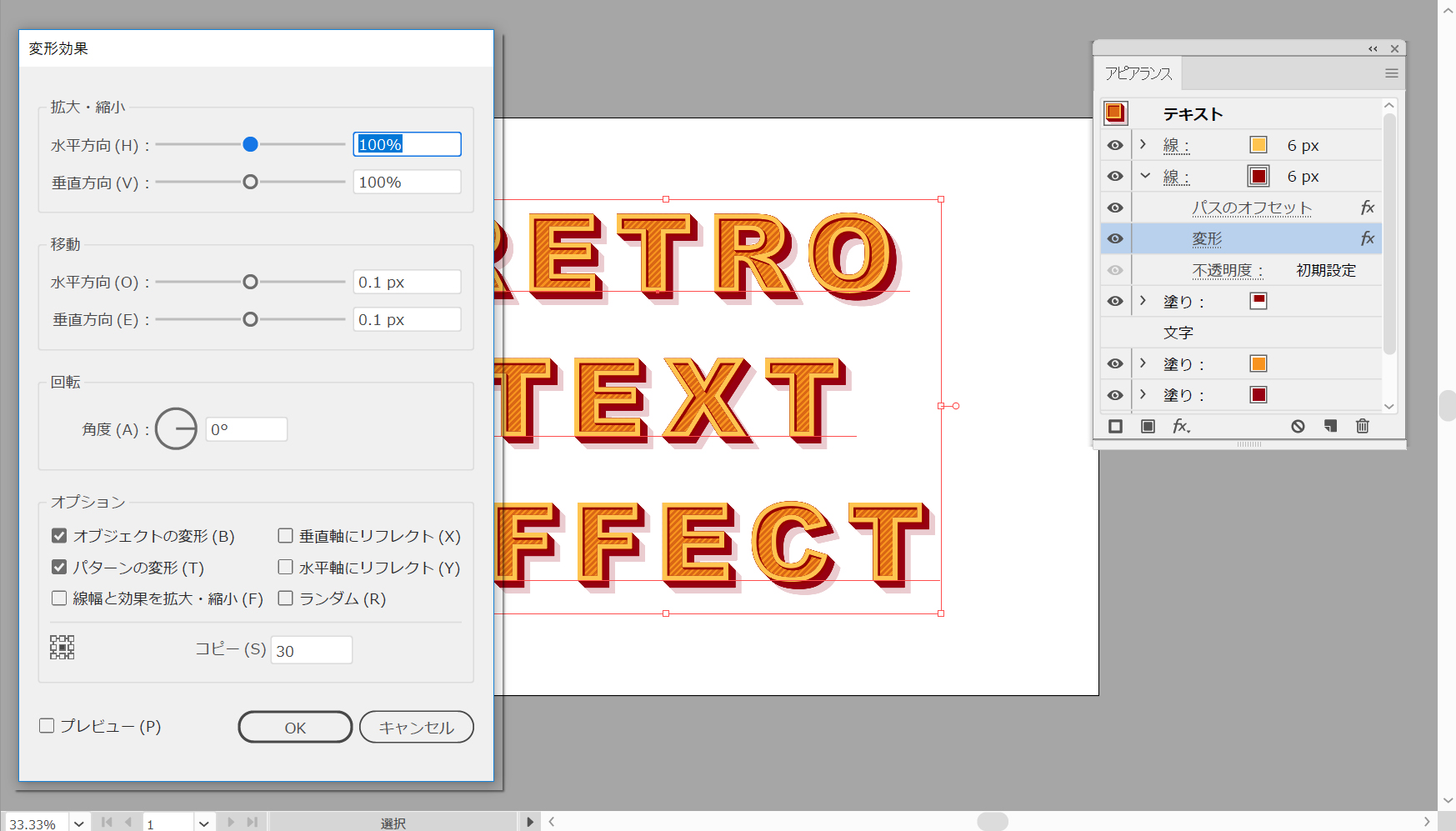 複製した境界線を選択し、既存の色を「#970000」に変更してから、[効果>パスの変形>変形]を選択します。 次の図に示す属性を入力して、「OK」ボタンをクリックします。