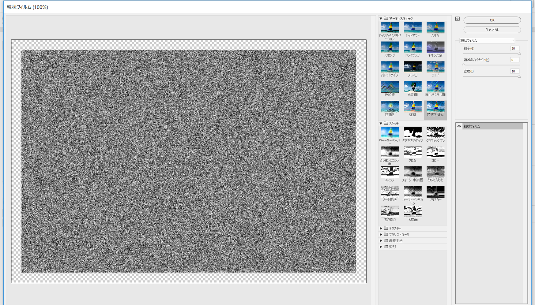 それを選択して、色を黒(#000000)に設定します。不透明度を15%に下げ、ブレンドモードをソフトライトに変更してから、[効果>効果ギャラリー>粒状フィルム]を選択します。 次の図に示す属性を入力して、「OK」ボタンをクリックします。