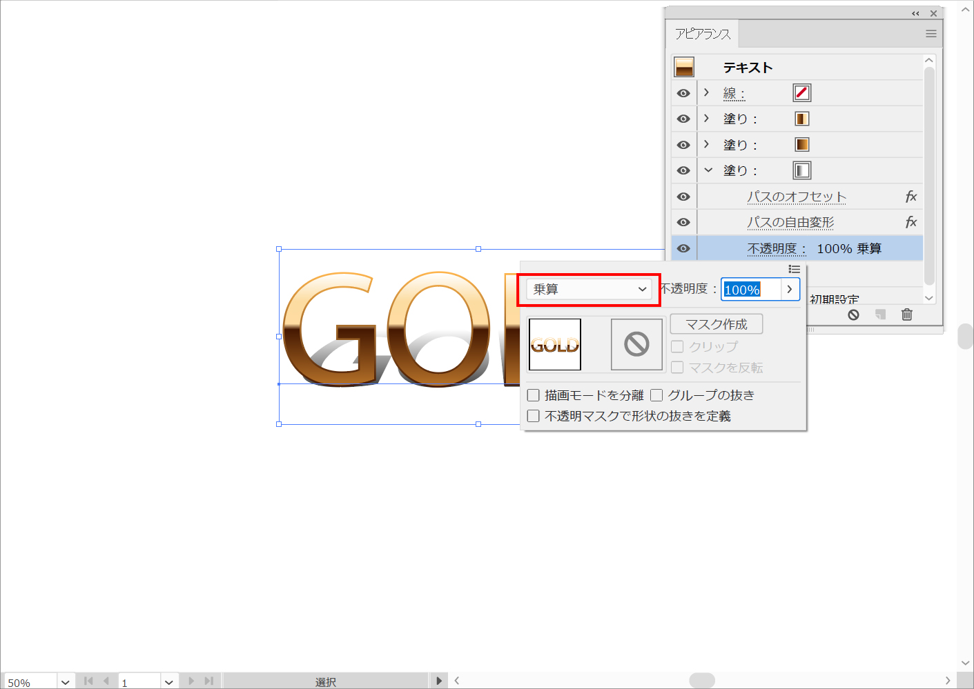 この塗りに乗算ブレンディングモードを適用します。これは、透明パネルまたはアピアランスパネルで変更できます。この手順では、テキストからリッチなドロップシャドウ効果を手動で作成しました。