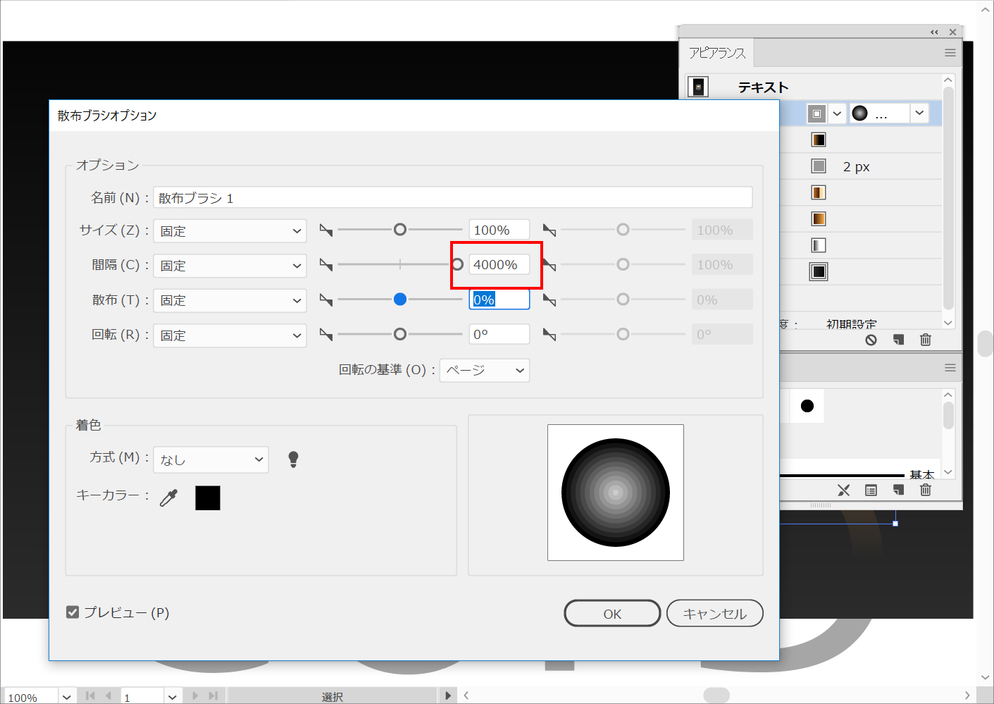 ブラシのパラメーターにアクセスするには、ブラシパネルの散布ブラシアイコンをダブルクリックします。「間隔」を4000%に設定し、OKをクリックします。